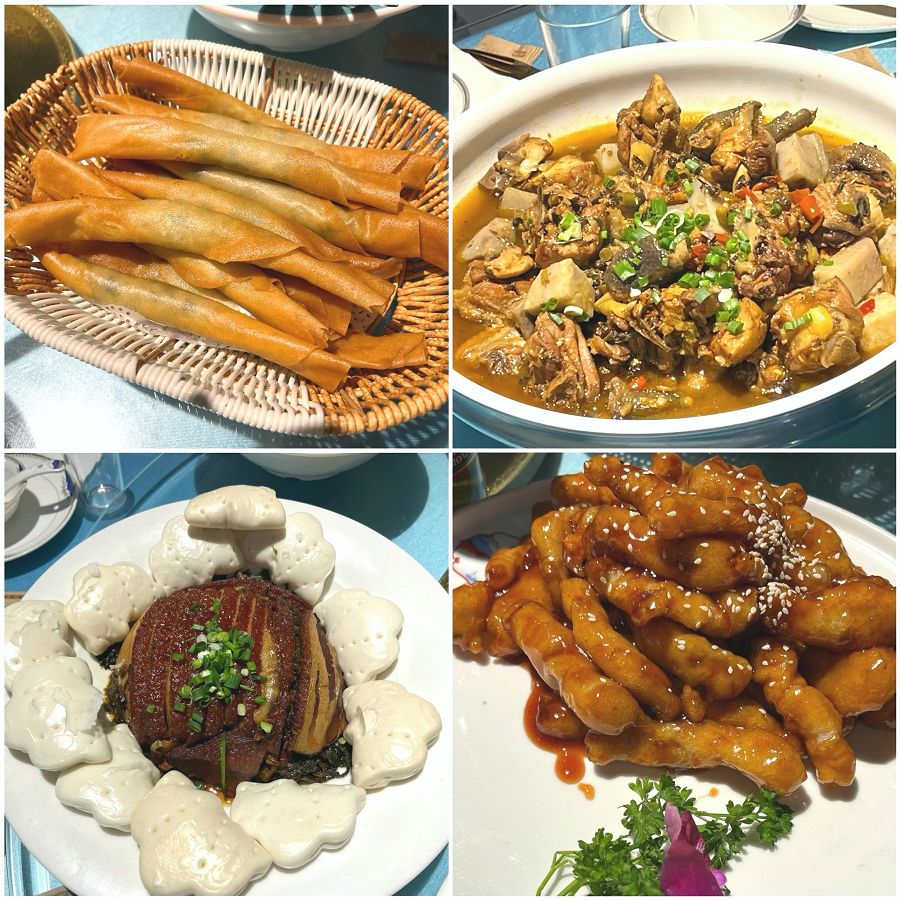 炸韭菜卷、芋頭燜雞、梅菜扣肉、糖醋雞柳、