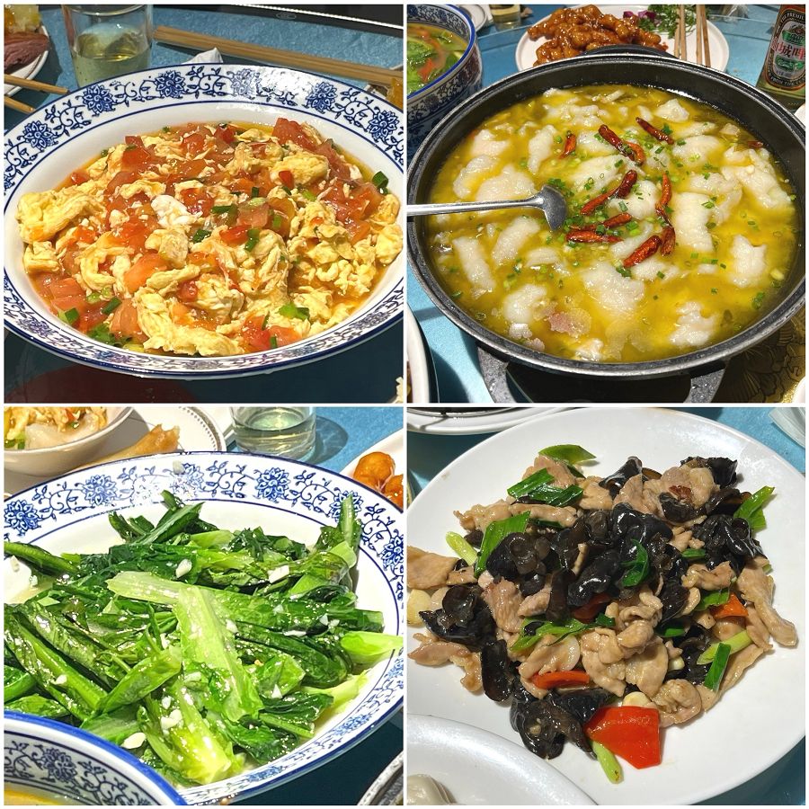 番茄炒蛋、酸菜魚湯、清炒萵苣、青紅椒木耳肉片。